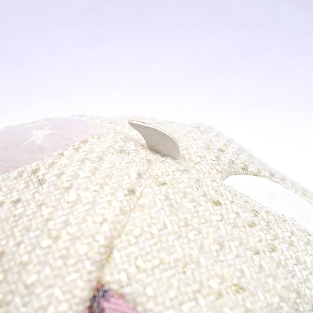 オフホワイトのツイードに、シーラカンスの体の模様をイメージしたさまざまな素材をパッチワークしています。